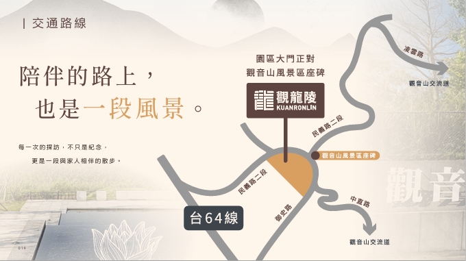 A. 觀龍陵墓園-花園仙境園區位於五股觀音山上,整座園區座落在「觀音山國家風景區」,並與「北海岸風景區」結合為「北觀國家風景區」。園區緊臨「觀音山國家風景區遊客服務中心」及「凌雲寺」,大門入口處即為「觀音山國家風景區座碑」。