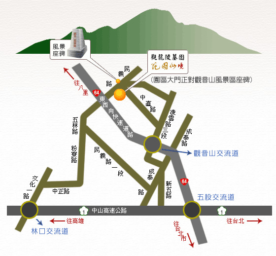 觀音山位於淡水、八里和五股間,東濱淡水河與淡水小鎮相望,西臨林口台地,北望無垠海洋,南接台北盆地。從樹林、新莊或淡水遠眺觀音山,峰稜連接,彷彿一幅莊嚴的觀世音側面像,若從圓山天文台上遠觀,則又如仰躺曲膝的觀音,靈氣天成,時而雲霧繚繞,時而晴空萬里,山上天然植被茂盛,因此自古便吸引了眾多出世高僧作為籌建寺廟的吉地。觀音山成為風水寶地可以從歷史文獻得到佐證,不論台灣府誌的記載以及百年來民間各派風水大師,皆肯定觀音山是北部最好的福地。 觀龍陵墓園-花園仙境所在的基地居高臨下展望極好,擁有寬廣的視野,可以看到整個林口的台地景觀,看著公路蜿蜒展開於山谷之中,分布在台地和山谷間的社區,象徵著生命的價值;往北看去,可以看到海與天的交會,除了景色天成,想著隔海的人們,以及唐山過台灣的歷史,發自內心的慎終和追遠不禁油然而生。